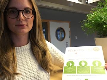 Louise Liedholm visar upp informationen som nu sätts upp i trapphusen i Helsingborgshems fastigheter.